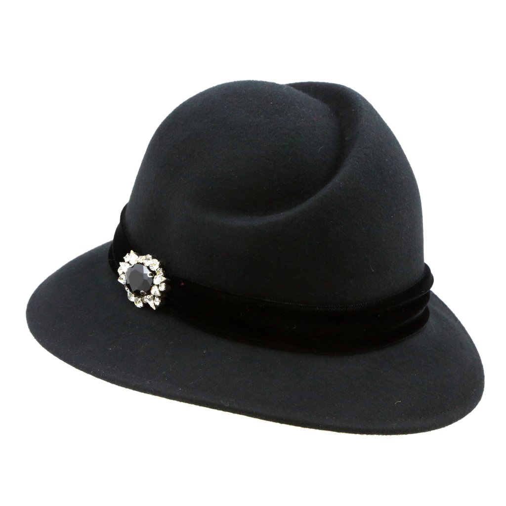 Dámský velmi elegantní plstěný klobouk, zdobený sametovou stuhou stejné barvy a doplněn o krásnou brož doplní Váš vzhled, ať už se chystáte na pracovní schůzku, nebo třeba do divadla. Klobouk je bez podšívky a má vnitřní pružný potní pásek. Odpovídá obvodu hlavy: 56 - 57 cmDoplňkové parametry