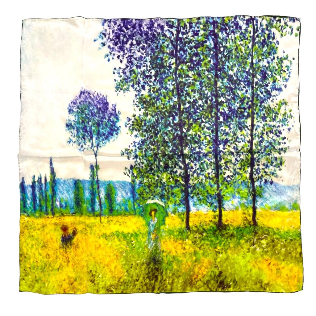 CLAUDE MONET - Pod topoly Slavný motiv malíře Claude Moneta (1840 - 1926). Jemný hedvábný šátek, na kterém je vyobrazena paní Monetová se synem na procházce. Lehounký a velmi příjemný na omak. Krásná splývavá kvalita materiálu, pevná a jemná. S tímto šátkem ukážete svůj styl a eleganci při slavnostní příležitosti, obchodním jednání, ale i ve volném čase. Tento luxusní šátek z přírodního hedvábí dodá každému outfitu nádech elegance a přepychu. Dotáhne váš vzhled k dokonalosti a rozzáří váš den. Velký rozměr umožňuje uvázat ho dle vašeho přání kolem krku, do vlasů, na kabelku. Záleží jenom na vaší fantazii. Vždy podtrhne váš šarm. Vhodný i jako skvělý tip na dárek pro vaše blízké k narozeninám, ke Dni matek, Valentýnu, Vánocům.Doplňkové parametry