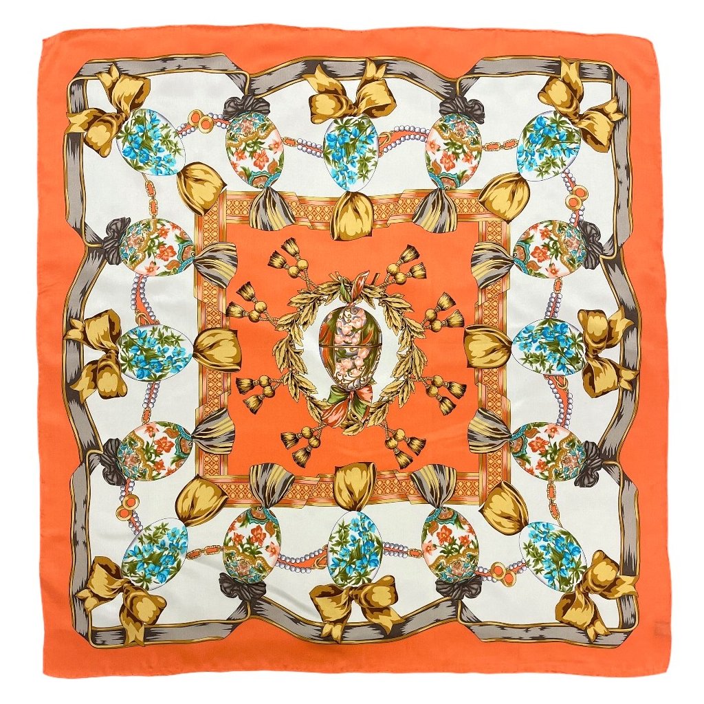 FABERGÉHO VEJCE Jemný hedvábný šátek ozdobený potiskem se vzorem Fabergého vejce v oranžové barvě. Lehounký a velmi příjemný na omak. Hedvábný šátek s potiskem využijete k jakémukoliv oblečení. Je vhodný ke každodennímu nošení.Doplňkové parametry