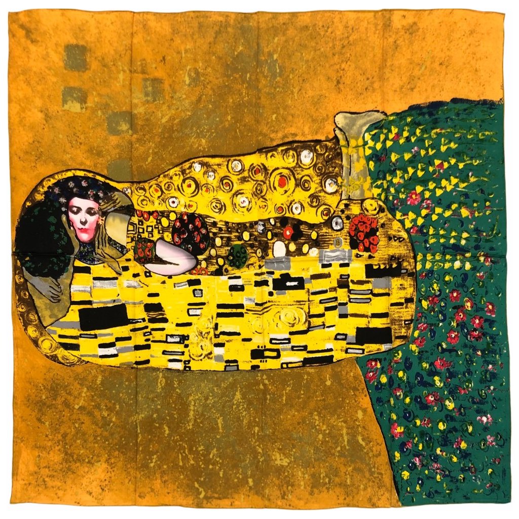GUSTAV KLIMT - Polibek Slavný motiv významného vídeňského secesního malíře Gustava Klimta (1862-1918). Původní verzi je možné obdivovat ve Vídni, v "Galerii Belvedere". Hedvábný šátek je tedy nejen krásný doplněk, ale také skutečné krédo pro lásku.Doplňkové parametry