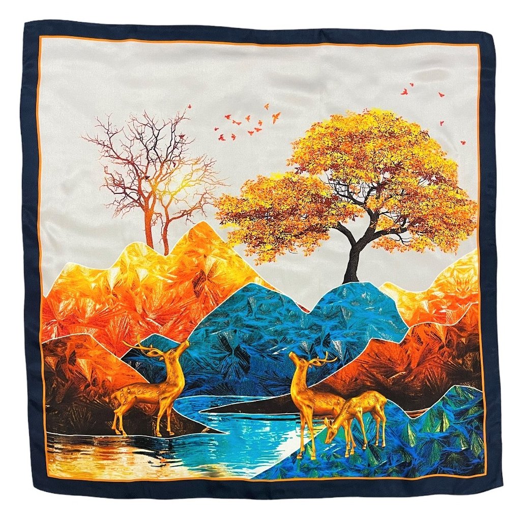 JELENI Jemný hedvábný šátek ozdobený potiskem s motivem jelenů u řeky v barvách podzimu. Lehounký a velmi příjemný na omak. Hedvábný šátek s potiskem využijete k jakémukoliv oblečení. Je vhodný ke každodennímu nošení.Doplňkové parametry