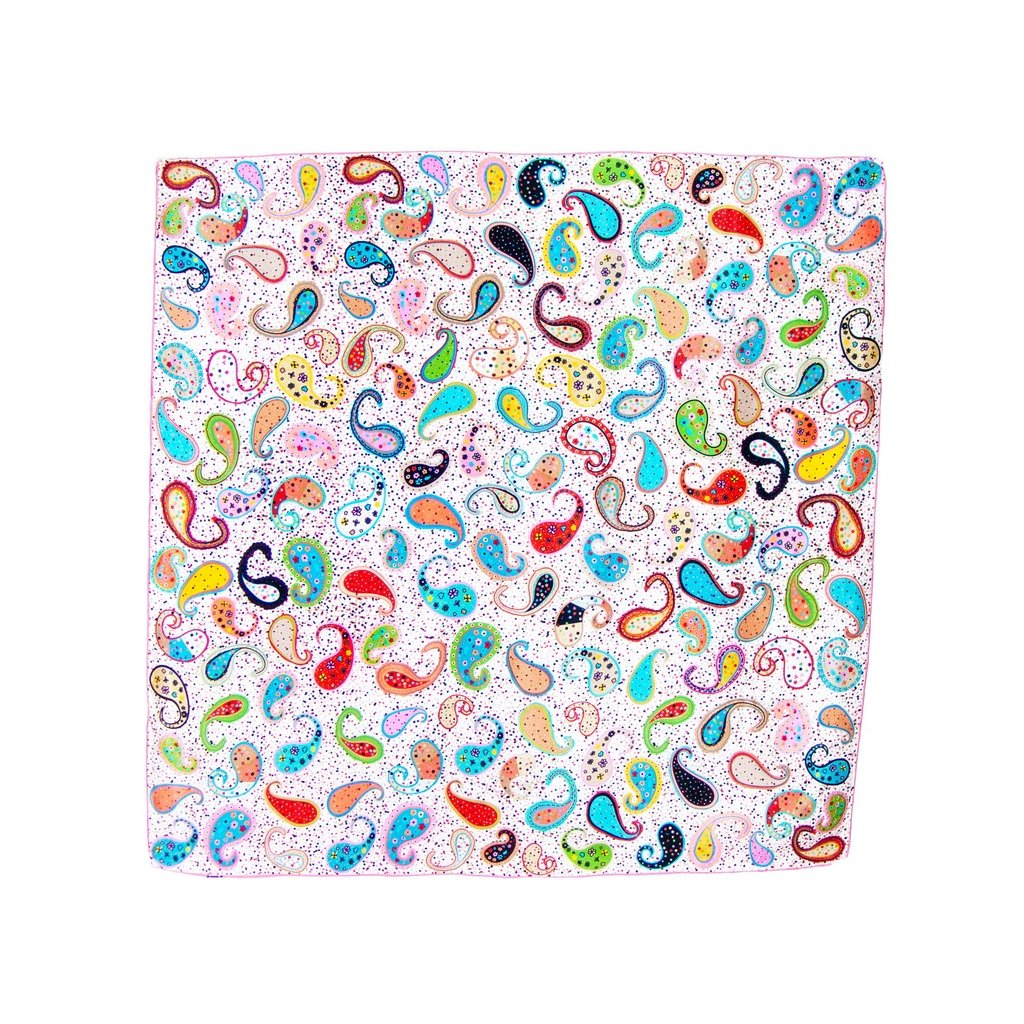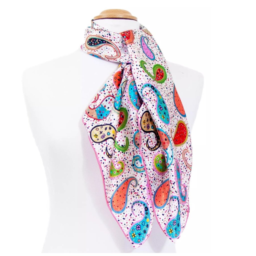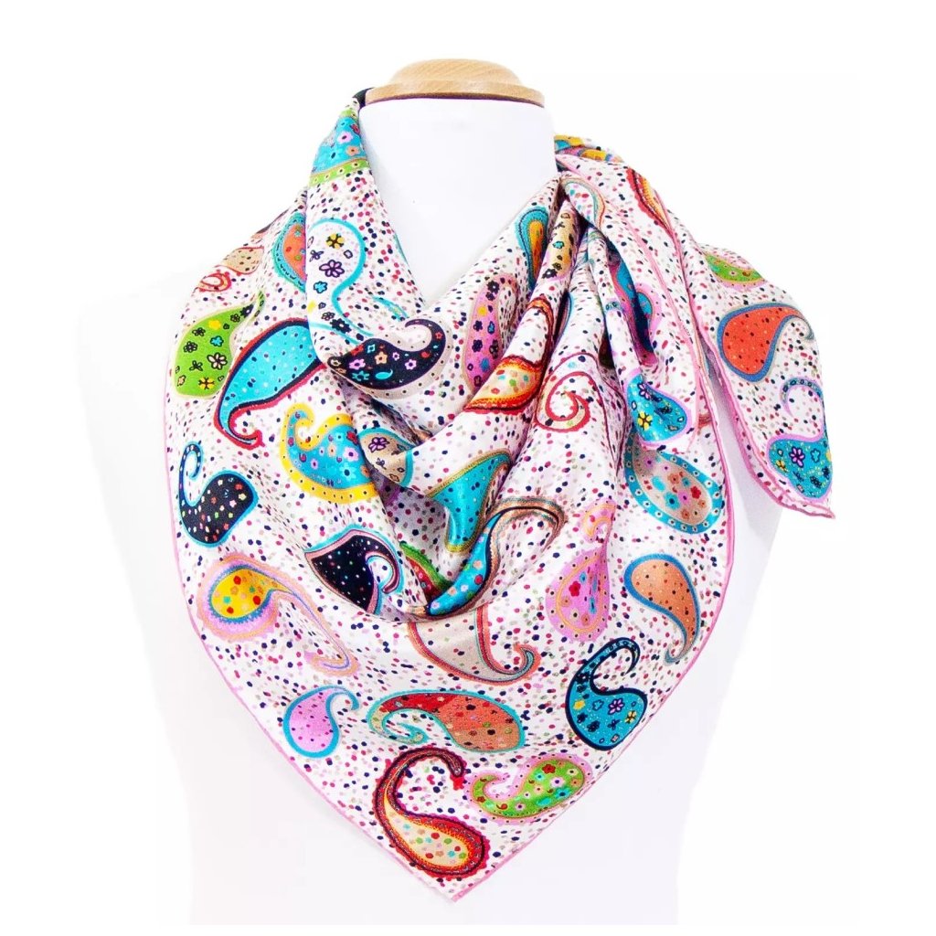 Kašmírový vzor na bílém podkladu Jemný hedvábný šátek s barevným kašmírovým vzorem. Lehounký a velmi příjemný na omak. Hedvábný šátek s potiskem využijete k jakémukoliv oblečení. Je vhodný jak ke každodennímu nošení tak i na slavnostní příležitosti.Doplňkové parametry