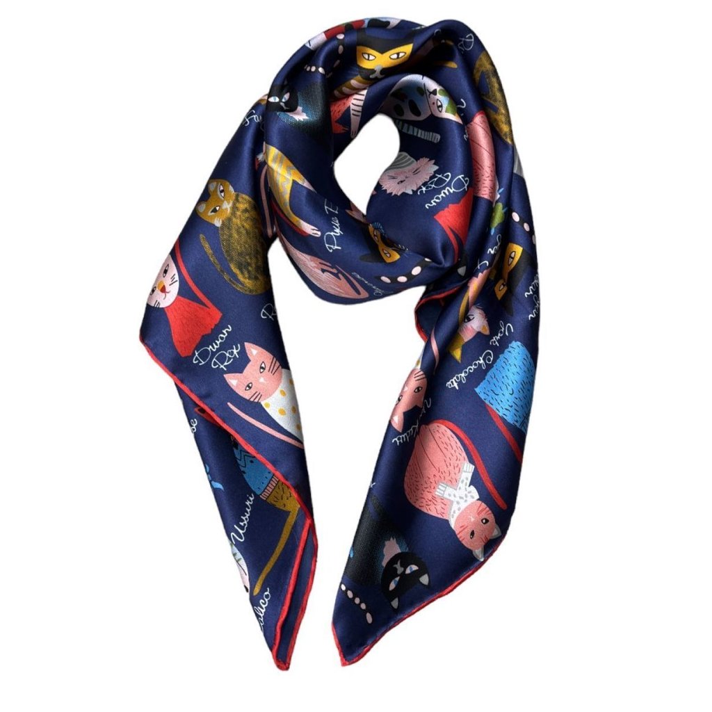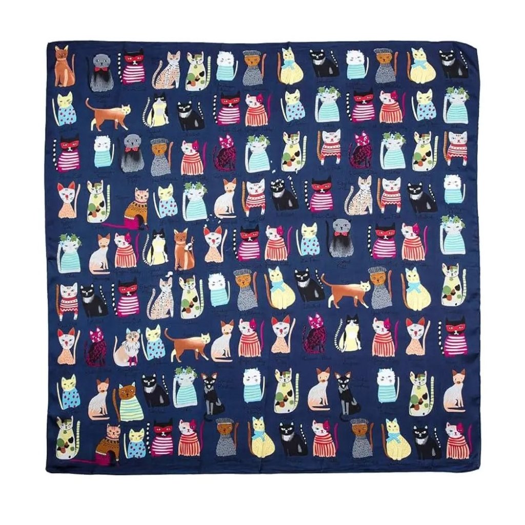 LAUREL BURCH - Barevné kočky na modrém podkladu Dámský hedvábný elegantní šátek s motivy koček od americké umělkyně, designérky a podnikatelky Laurel Burch dokonale doplní váš vzhled, ať už se chystáte na pracovní schůzku, na rande nebo jen na nedělní procházku s dětmi.Doplňkové parametry